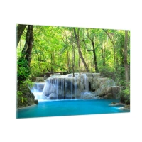 Impression sur verre - Image sur verre - Une cascade entourée d'arbres verts et d'eau bleue - 100x70cm - Se noyer dans le turquoise et le vert - Décoration murale moderne pour le salon et la chambre ARTTOR