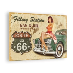 Papier Peint Photo Premium Canvas - Affiche rétro de la Route 66 avec une pin-up et une voiture - 100x70cm - Les superbes années 40. - Décoration murale moderne pour le salon et la chambre ARTTOR