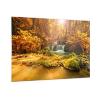 Impression sur verre - Image sur verre - Cascade forestière en or - 100x70cm - Cascade de forêt en or - Décoration murale moderne pour le salon et la chambre ARTTOR