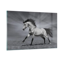 Impression sur verre - Image sur verre - Une photo en noir et blanc d'un cheval galopant dans un champ ouvert. - 120x80cm - Né pour séduire - Décoration murale moderne pour le salon et la chambre ARTTOR