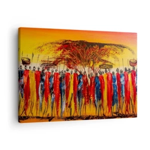 Impression sur toile - Image sur toile - Une scène colorée avec des personnages africains sur fond de soleil couchant. - 120x80cm - Là-bas, là-bas, ils vont là-bas - Décoration murale moderne pour le salon et la chambre ARTTOR