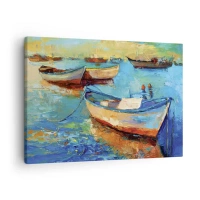 Impression sur toile - Image sur toile - Bateaux colorés amarrés sur une eau calme - 70x50cm - Dans la baie du sud - Décoration murale moderne pour le salon et la chambre ARTTOR