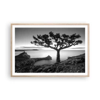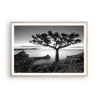 Affiche - Poster - Paysage noir et blanc avec un arbre solitaire sur une falaise au-dessus de la mer - 100x70cm - Paix jusqu'à l'horizon - Décoration murale moderne pour le salon et la chambre ARTTOR