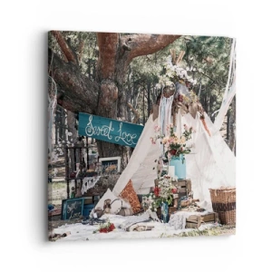 Impression sur toile - Image sur toile - Décoration bohème avec un tipi dans la forêt - 70x50cm - Make love… - Décoration murale moderne pour le salon et la chambre ARTTOR