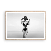 Affiche dans un cadre noir - Poster - Silhouette noire et blanche d'une femme portant un chapeau sur fond de mer - 100x70cm - Mon prénom? Élégance - Décoration murale moderne pour le salon et la chambre ARTTOR