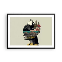 Affiche dans un cadre noir - Poster - Collage d'une femme avec un paysage de montagne et des fleurs - 70x50cm - La femme – toujours un mystère - Décoration murale moderne pour le salon et la chambre ARTTOR