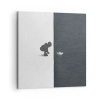 Impression sur toile - Image sur toile - Une figure d'enfant avec un bateau en papier sur un fond de moitiés contrastées - 100x70cm - Grande expédition - Décoration murale moderne pour le salon et la chambre ARTTOR