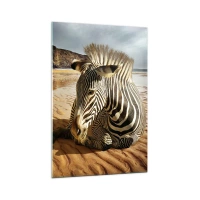Impression sur verre - Image sur verre - Un zèbre se reposant sur une plage de sable avec des falaises en arrière-plan. - 70x100cm - On va bien ensemble - Décoration murale moderne pour le salon et la chambre ARTTOR