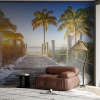 Papier Peint Photo Standard Eco - Chemin en bois menant à la plage parmi les palmiers au coucher du soleil - 100x70cm - Directement au paradis - Décoration murale moderne pour le salon et la chambre ARTTOR
