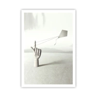 Impression sur verre - Image sur verre - Une main en bois minimaliste avec un cerf-volant sur un fond de paysage. - 70x100cm - Épreuve de force - Décoration murale moderne pour le salon et la chambre ARTTOR
