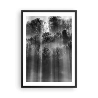 Affiche dans un cadre noir - Poster - Forêt noire et blanche dans le brouillard avec les rayons du soleil - 50x70cm - Dans les flots de lumière - Décoration murale moderne pour le salon et la chambre ARTTOR
