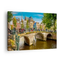 Papier Peint Photo Premium Canvas - Un canal pittoresque avec un pont à Amsterdam - 100x70cm - Le printemps sur le canal - Décoration murale moderne pour le salon et la chambre ARTTOR