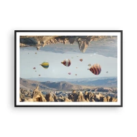 Affiche dans un cadre noir - Poster - Ballons colorés au-dessus d'un paysage rocheux - 100x70cm - Ici, tout est possible - Décoration murale moderne pour le salon et la chambre ARTTOR