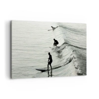 Impression sur toile - Image sur toile - Surfeurs sur les vagues dans une photo monochrome - 120x80cm - A la rencontre de la vague - Décoration murale moderne pour le salon et la chambre ARTTOR