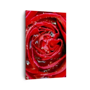 Impression sur toile - Image sur toile - Gros plan d'une rose rouge avec des gouttes d'eau sur les pétales - 80x120cm - Dans les gouttes de rosée - Décoration murale moderne pour le salon et la chambre ARTTOR