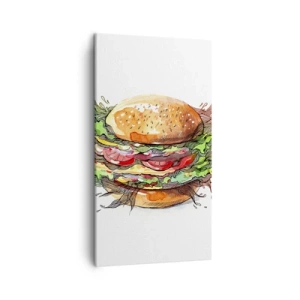 Impression sur toile - Image sur toile - Illustration artistique d'un burger avec des éléments dynamiques - 50x70cm - Tentation chaude - Décoration murale moderne pour le salon et la chambre ARTTOR