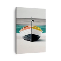 Impression sur toile - Image sur toile - Un bateau sur la plage avec une mer turquoise en arrière-plan - 50x70cm - A sa place - Décoration murale moderne pour le salon et la chambre ARTTOR