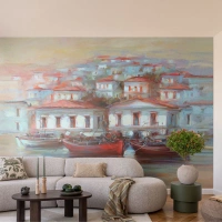 Papier Peint Photo Standard Eco - Petite ville heureuse - Architecture, Voilier, port - 300x210 cm