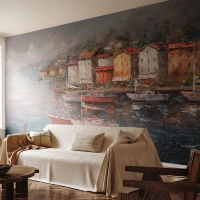 Papier Peint Photo Premium Canvas - Havre romantique - Architecture, Ville portuaire, Voilier - 250x175 cm