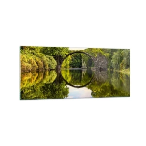 Impression sur verre - Image sur verre - Un pont de pierre sur une rivière avec un reflet parfait dans l'eau - 120x50cm - À la jonction de deux mondes - Décoration murale moderne pour le salon et la chambre ARTTOR