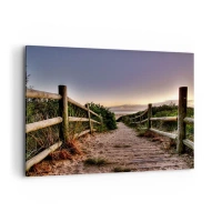 Impression sur toile - Image sur toile - Chemin en bois dans les dunes menant à la plage au coucher du soleil - 120x80cm - On voit déjà le but - Décoration murale moderne pour le salon et la chambre ARTTOR
