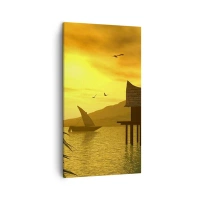 Impression sur toile - Image sur toile - Coucher de soleil tropical sur l'eau avec une maison en bois sur pilotis. - 80x120cm - La paix tant désirée - Décoration murale moderne pour le salon et la chambre ARTTOR
