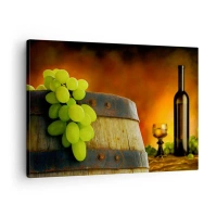 Impression sur toile - Image sur toile - Raisins sur un tonneau de vin avec une palette de couleurs chaudes en arrière-plan - 70x50cm - Nature morte avec une bouteille de vin et une grappe de raisin