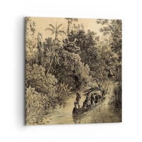 Impression sur toile - Image sur toile - Dessin d'une jungle avec un bateau sur une rivière - 80x120cm - Expédition à la source - Décoration murale moderne pour le salon et la chambre ARTTOR