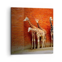 Impression sur toile - Image sur toile - Quatre girafes contre un mur de briques dans un décor artistique - 80x120cm - Voyez-vous des acacias ? - Décoration murale moderne pour le salon et la chambre ARTTOR