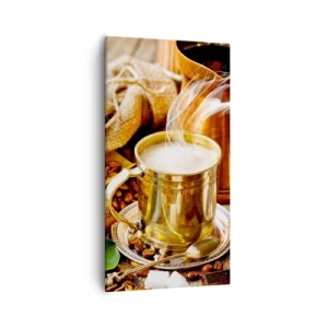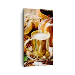Impression sur toile - Image sur toile - Une tasse de café dorée entourée de grains, de cruches et de croissants - 120x80cm - Bonne journée! - Décoration murale moderne pour le salon et la chambre ARTTOR