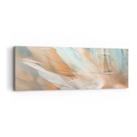 Impression sur toile - Image sur toile - Plumes délicates dans des tons pastel de bleu et d'orange - 120x50cm - Au pays de la douceur - Décoration murale moderne pour le salon et la chambre ARTTOR
